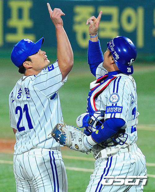 경기후 승리한 삼성 오승환과 진갑용이 승리 세리머니를 하고 있다./jpnews@osen.co.kr