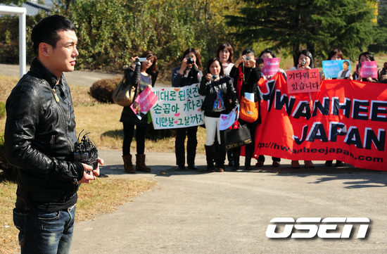 [OSEN=논산 ,백승철 인턴기자] 27일 오후 육군 논산훈련소를 통해 입소하는 가수 환희가 훈련소 인근 주차장에서 취재진들과 인터뷰를 하고 있다.