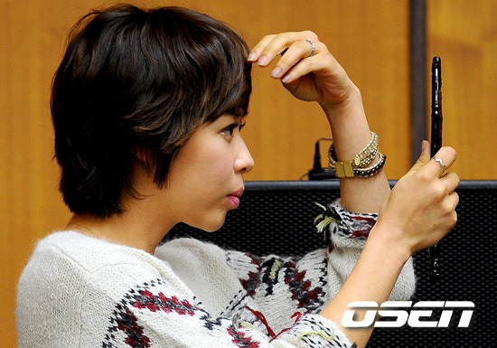 27일 오후 서울 여의도 KBS 신관 5층 국제회의실에서 진행된 '2011년 가을 KBS Radio 프로그램 개편 설명회'에서 배우 최강희가 거울을 보고 있다.