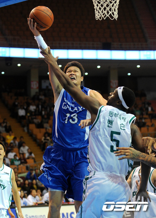 3쿼터 삼성 이규섭이 동부 벤슨의 수비를 피해 레이업슛을 시도하고 있다.