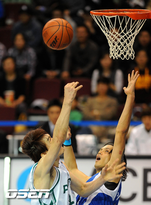 4쿼터 동부 김주성이 삼성 이승준의 수비를 피해 슛을 시도하고 있다.