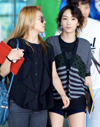 소녀시대 태연은 블랙 컬러의 핫팬츠로 스타일리시한 공한패션을 선보인 반면 김선아는 편안한 팬츠와 운동화를 매치해서 내추럴한 스타일로 편안한 매력을 더했다.