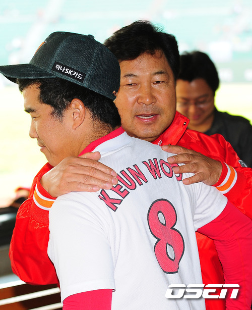 28일 오후 인천문학구장에서 열린 ‘2011 롯데카드 프로야구 한국시리즈 3차전’ SK 와이번스와 삼성 라이온즈의 경기에 앞서 SK 이만수 감독 대행이 정근우와 덕아웃에서 포옹을 하고 있다.