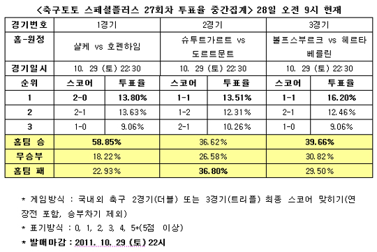 국민체육진흥공단(www.kspo.or.kr)이 발행하는 체육진흥투표권 수탁사업자인 스포츠토토 공식 온라인 발매 사이트인 베트맨(www.betman.co.kr)은 29일 펼쳐지는 샬케-호펜하임(1경기)전, 슈투트가르트-도르트문트(2경기)전, 볼프스부르크-헤르타 베를린(3경기)전 등 독일 분데스리가 3경기를 대상으로 한 축구토토 스페셜플러스 27회차 투표율 중간집계 결과, 국내 축구팬들의 39.66%는 볼프스부르크-헤르타 베를린(3경기)전에서 구자철이 속한 볼프스부르크의 승리를 전망했다고 밝혔다.