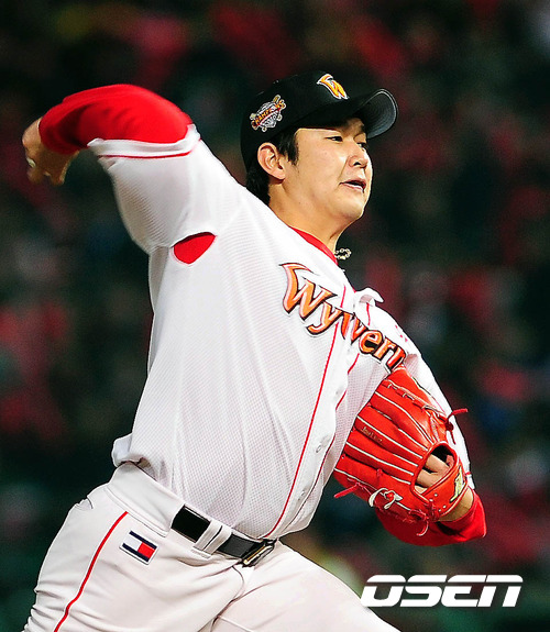 '2011 롯데카드 프로야구 한국시리즈' 3차전 SK 와이번스와 삼성 라이온즈의 경기 1회초 SK 선발투수 송은범이 힘차게 공을 던지고 있다.
