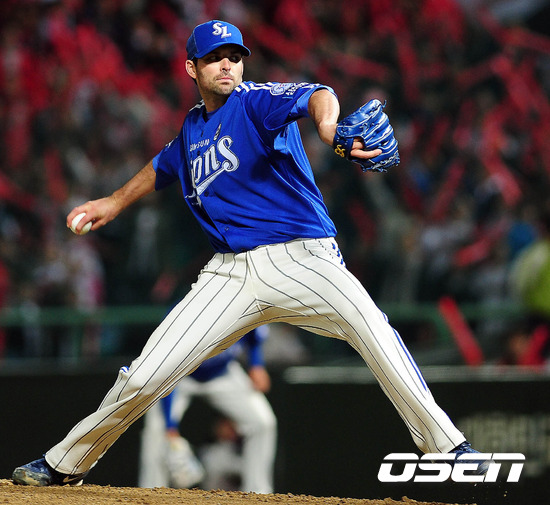 '2011 롯데카드 프로야구 한국시리즈' 3차전 SK 와이번스와 삼성 라이온즈의 경기 1회말 삼성 선발투수 저마노가 힘차게 공을 던지고 있다.