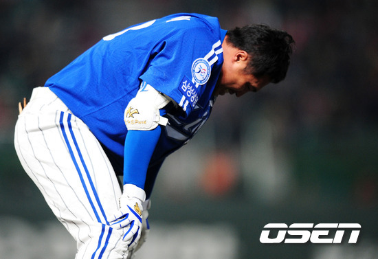 '2011 롯데카드 프로야구 한국시리즈' 3차전 SK 와이번스와 삼성 라이온즈의 경기, 1회초 1사에서 삼성 박한이가 기습번트를 시도하고 1루에서 헤드퍼스트슬라이딩을 했지만 아웃되자 아쉬워하고 있다.