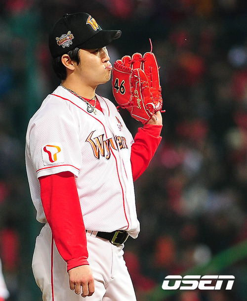 '2011 롯데카드 프로야구 한국시리즈' 3차전 SK 와이번스와 삼성 라이온즈의 경기 3회초 송은범이 박한이를 볼넷으로 내보내 만루를 만들고 아쉬워 하고 있다.
