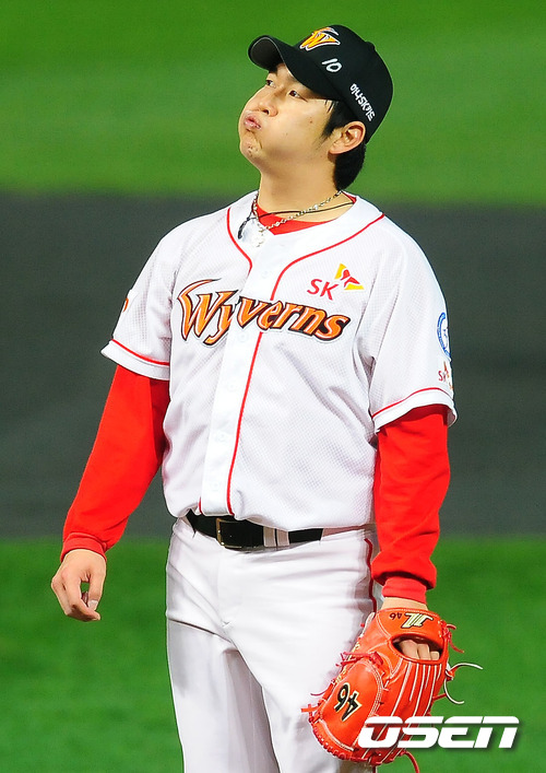'2011 롯데카드 프로야구 한국시리즈' 3차전 SK 와이번스와 삼성 라이온즈의 경기 3회초 1사 주자 2,3루 삼성 박한이에게 포볼을 던져 만루가 되자 SK 선발 송은범이 아쉬워하고 있다.