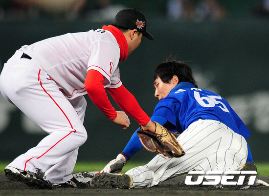 '2011 롯데카드 프로야구 한국시리즈' 3차전 SK 와이번스와 삼성 라이온즈의 경기, 3회초 1사 1,3루에서 삼성 배영섭이 SK 박진만의 태그에 앞서 2루 도루에 성공하고 있다.