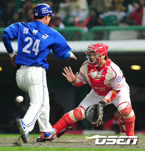 '2011 롯데카드 프로야구 한국시리즈' 3차전 SK 와이번스와 삼성 라이온즈의 경기 4회초 2사 2루 진갑용의 좌전 안타때 2루주자 강봉규가 홈에서 아웃되고 있다.