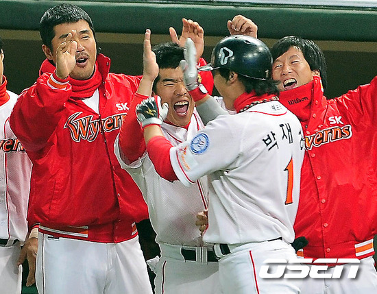 '2011 롯데카드 프로야구 한국시리즈' 3차전 SK 와이번스와 삼성 라이온즈의 경기 4회말 1사 박재상이 좌측 펜스를 넘어가는 솔로홈런을 치고 동료들의 환영을 받고 있다.