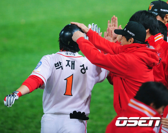 '2011 롯데카드 프로야구 한국시리즈' 3차전 SK 와이번스와 삼성 라이온즈의 경기 4회말 1사 주자 없이 SK 박재상이 선취 솔로홈런을 날린 후 덕아웃에서 동료들의 축하를 받고 있다.