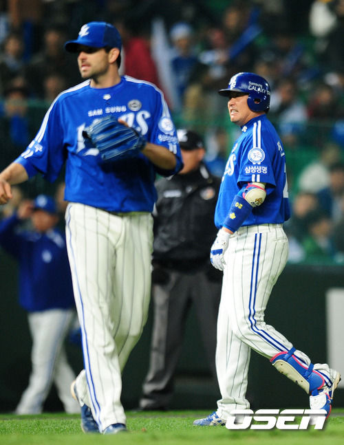 '2011 롯데카드 프로야구 한국시리즈' 3차전 SK 와이번스와 삼성 라이온즈의 경기, 4회초 2사 2루에서 삼성 진갑용이 적시타를 날렸지만 2루주자 강봉규가 홈에서 아웃되자 아쉬운 표정을 지으며 더그아웃으로 향하고 있다.