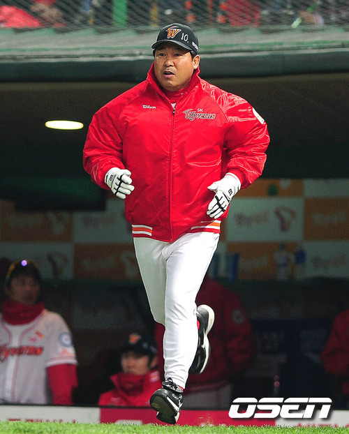 '2011 롯데카드 프로야구 한국시리즈' 3차전 SK 와이번스와 삼성 라이온즈의 경기 4회초 2사 2루 이만수 감독이 구심의 볼 판정에 어필하기 위해 달려 나가고 있다.
