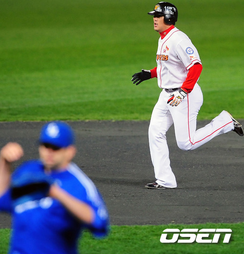 '2011 롯데카드 프로야구 한국시리즈' 3차전 SK 와이번스와 삼성 라이온즈의 경기 5회말 1사 SK 최동수가 좌중월 솔로포를 날린 후 그라운드를 돌고 있다.