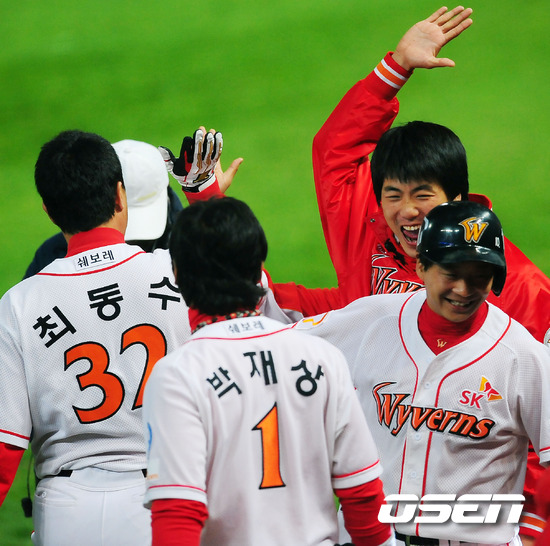'2011 롯데카드 프로야구 한국시리즈' 3차전 SK 와이번스와 삼성 라이온즈의 경기 5회말 1사 SK 최동수가 좌중월 솔로포를 날린 후 덕아웃에서 동료들과 기쁨을 나누고 있다.