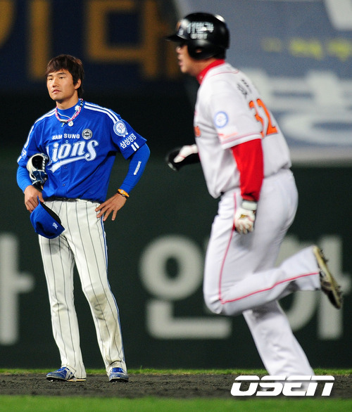 '2011 롯데카드 프로야구 한국시리즈' 3차전 SK 와이번스와 삼성 라이온즈의 경기, 5회말 1사에서 SK 최동수가 솔로포를 날리자 삼성 김상수가 허탈한 표정을 짓고 있다.