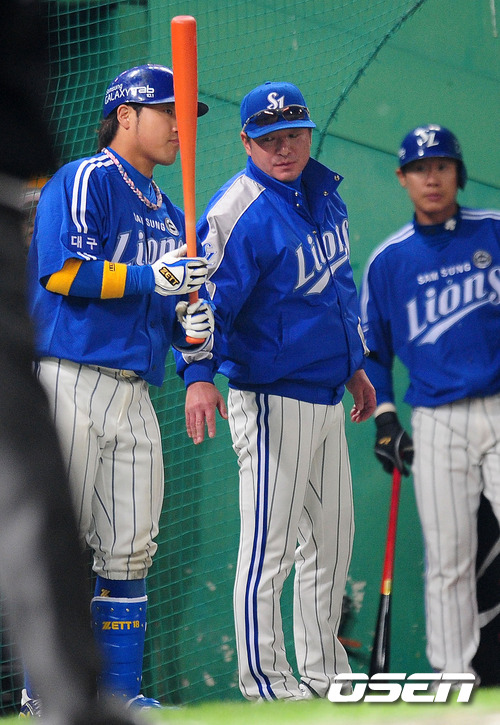 '2011 롯데카드 프로야구 한국시리즈' 3차전 SK 와이번스와 삼성 라이온즈의 경기, 8회초 2사 1,3루에서 SK가 정우람에서 엄정욱으로 투수를 교체하자 삼성 류중일 감독이 박석민과 이야기를 나누고 있다.