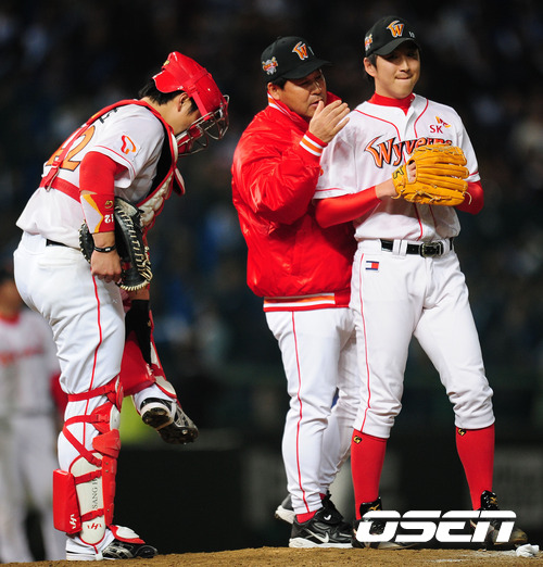 '2011 롯데카드 프로야구 한국시리즈' 3차전 SK 와이번스와 삼성 라이온즈의 경기, 8회초 2사 1,3루에서 KS 이만수 감독대행이 정우람을 교체하며 이야기를 나누고 있다.
