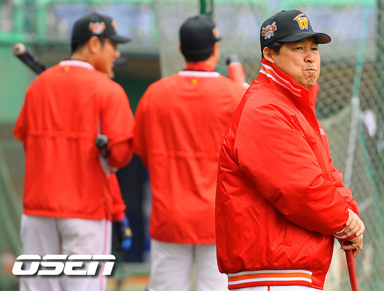 29일 오전 인천 문학구장서 열리는 '2011 롯데카드 프로야구 한국시리즈 4차전' SK 와이번스와 삼성 라이온즈의 경기에 앞서 SK 이만수 감독대행이 선수들의 훈련을 지켜보고 있다.