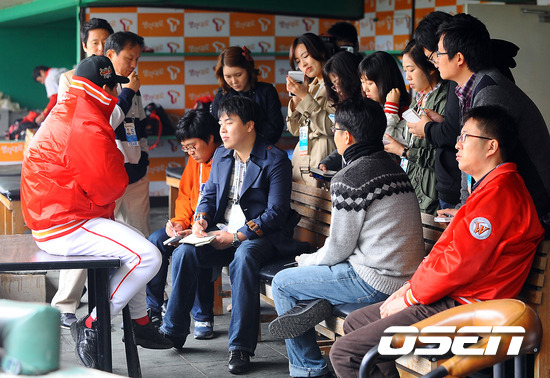 29일 오전 인천 문학구장서 열리는 '2011 롯데카드 프로야구 한국시리즈 4차전' SK 와이번스와 삼성 라이온즈의 경기에 앞서 SK 이만수 감독대행이 취재진과 인터뷰를 하고 있다