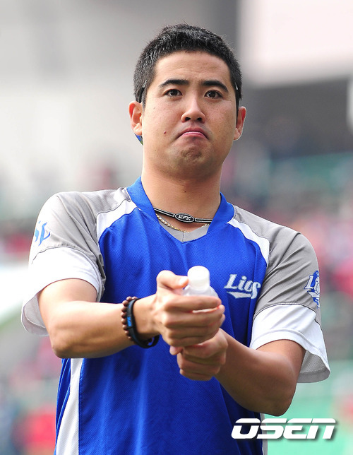 '2011 롯데카드 프로야구 한국시리즈' 4차전 SK 와이번스와 삼성 라이온즈의 경기 전 장원삼이 패트병의 압력을 이용해 병뚜껑을 날리며 장난을 치고 있다.
