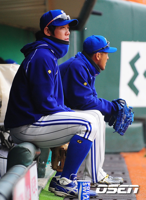 29일 오후 인천문학구장에서 열린 ‘2011 롯데카드 프로야구 한국시리즈 4차전’ SK 와이번스와 삼성 라이온즈의 경기가 열릴 예정인 가운데 경기 전 양팀의 훈련시간에서 조동찬이 SK의 훈련을 지켜보고 있다.