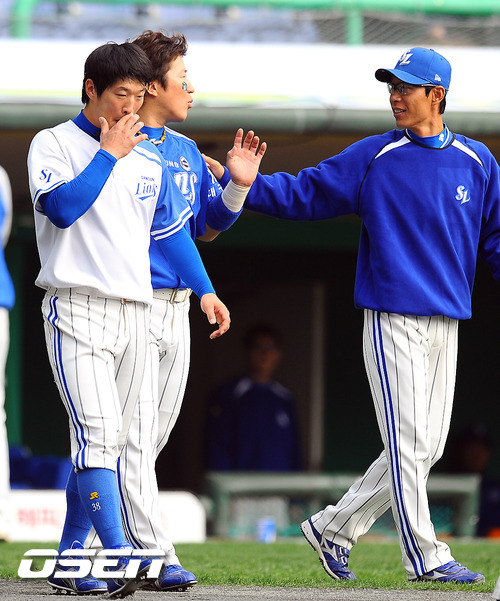 29일 오전 인천 문학구장서 열리는 '2011 롯데카드 프로야구 한국시리즈 4차전' SK 와이번스와 삼성 라이온즈의 경기에 앞서 삼성 최형우가 김재걸 코치와 이야기를 나누고 있다.