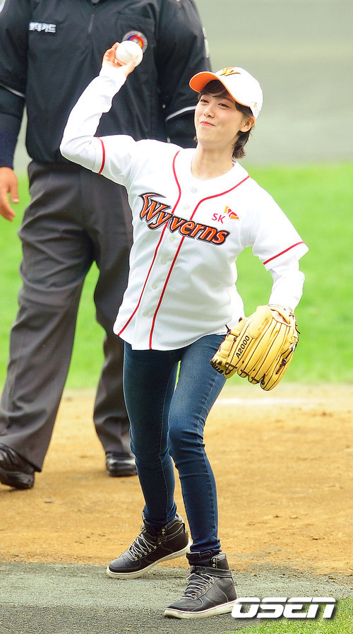 '2011 롯데카드 프로야구 한국시리즈' 4차전 SK 와이번스와 삼성 라이온즈의 경기에 앞서 인기 탤런트 구혜선이 멋진 폼으로 시구를 하고 있다.