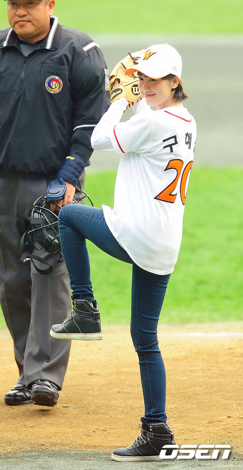 '2011 롯데카드 프로야구 한국시리즈' 4차전 SK 와이번스와 삼성 라이온즈의 경기에 앞서 인기 탤런트 구혜선이 멋진 폼으로 시구를 하고 있다.