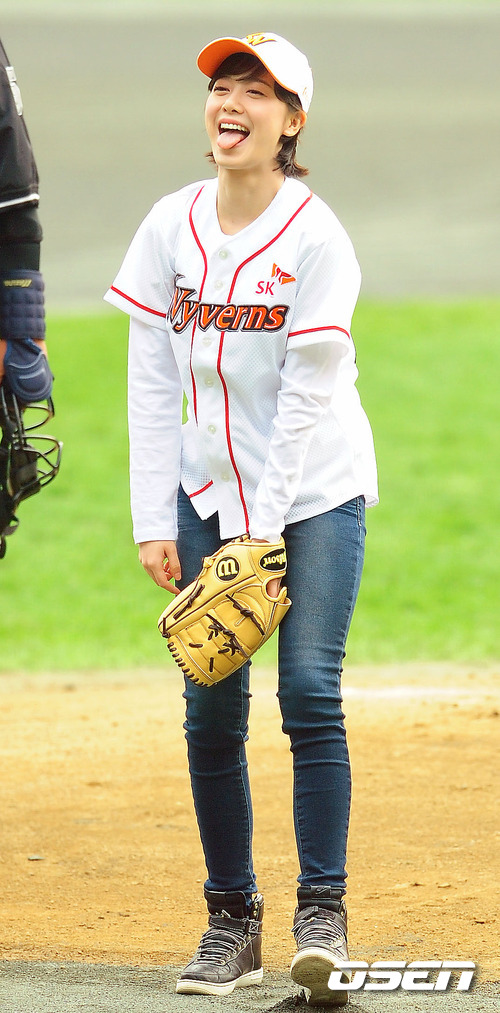 '2011 롯데카드 프로야구 한국시리즈' 4차전 SK 와이번스와 삼성 라이온즈의 경기에 앞서 인기 탤런트 구혜선이 멋진 폼으로 시구를 마친 후 혀를 내밀고 있다.