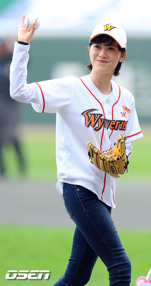 29일 오후 인천 문학구장서 열린 '2011 롯데카드 프로야구 한국시리즈 4차전' SK 와이번스와 삼성 라이온즈의 경기, 배우 구혜선이 시구를 마치고 퇴장하고 있다.