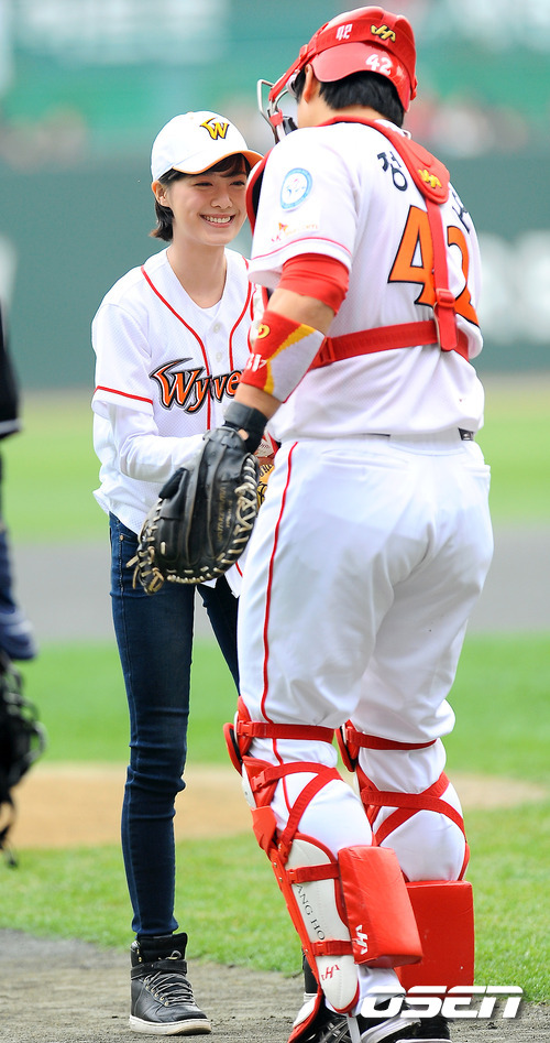 29일 오후 인천 문학구장서 열린 '2011 롯데카드 프로야구 한국시리즈 4차전' SK 와이번스와 삼성 라이온즈의 경기, 배우 구혜선이 시구를 마치고 정상호 포수에게 시구공을 건네받고 있다.