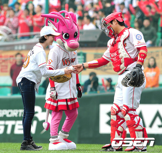'2011 롯데카드 프로야구 한국시리즈' 4차전 SK 와이번스와 삼성 라이온즈의 경기에 앞서 인기탤런트 구혜선이 멋진 폼으로 시구를 하고 있다.