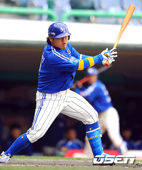 29일 오후 인천 문학구장서 열린 '2011 롯데카드 프로야구 한국시리즈 4차전' SK 와이번스와 삼성 라이온즈의 경기 1회초 1사 3루 상황에서 삼성 박석민이 선취 1타점 적시타를 날리고 있다.