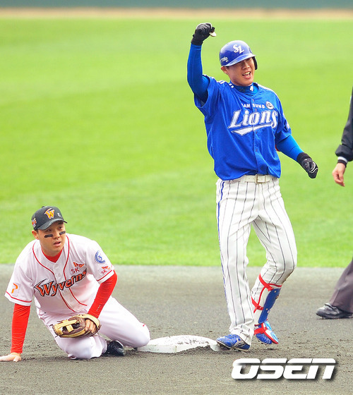 '2011 롯데카드 프로야구 한국시리즈' 4차전 SK 와이번스와 삼성 라이온즈의 경기에서 1회초 2사 주자 2루 삼성 강봉규가 1타점 적시타를 날린 후 2루에서 환호하고 있다.