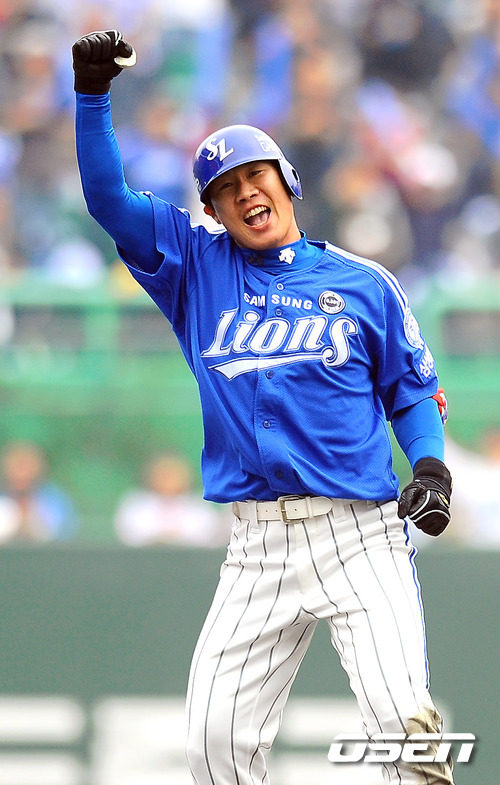 29일 오후 인천 문학구장서 열린 '2011 롯데카드 프로야구 한국시리즈 4차전' SK 와이번스와 삼성 라이온즈의 경기 1회초 2사 2루 상황에서 삼성 강봉규가 1타점 적시타를 날린후 환호하고 있다.