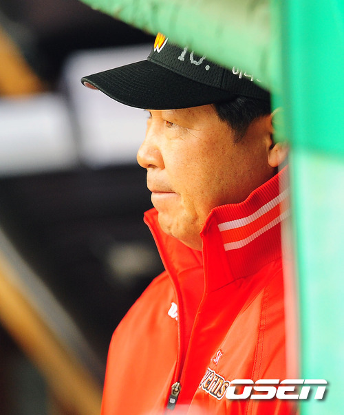 '2011 롯데카드 프로야구 한국시리즈' 4차전 SK 와이번스와 삼성 라이온즈의 경기에서 SK 김광현이 1회초 2점을 내주자 이만수 감독대행이 덕아웃에서 심각한 표정으로 김광현을 바라보고 있다.
