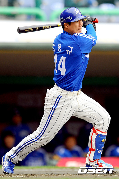 29일 오후 인천 문학구장서 열린 '2011 롯데카드 프로야구 한국시리즈 4차전' SK 와이번스와 삼성 라이온즈의 경기 1회초 2사 2루 상황에서 삼성 강봉규가 1타점 적시타를 날리고 있다.