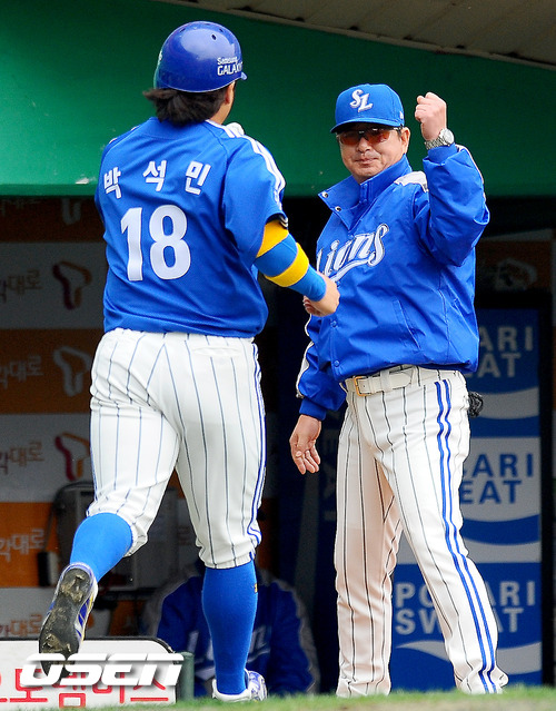 29일 오후 인천 문학구장서 열린 '2011 롯데카드 프로야구 한국시리즈 4차전' SK 와이번스와 삼성 라이온즈의 경기 1회초 2사 2루 상황에서 삼성 강봉규의 1타점 적시타때 류중일 감독이 2루 주자 박석민을 환영하고 있다.