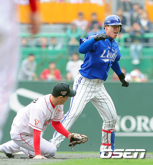 '2011 롯데카드 프로야구 한국시리즈' 4차전 SK 와이번스와 삼성 라이온즈의 경기 1회초 2사 2루 강봉규가 적시타를 치고 센스있는 주루플레이로 2루까지 진루하고 있다.