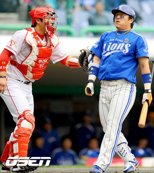 29일 오후 인천 문학구장서 열린 '2011 롯데카드 프로야구 한국시리즈 4차전' SK 와이번스와 삼성 라이온즈의 경기 1회초 1사 2루 삼성 최형우가 스트라이크 낫아웃되고 있다.