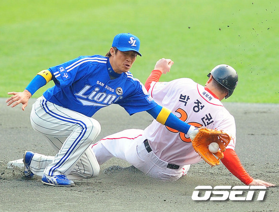 '2011 롯데카드 프로야구 한국시리즈' 4차전 SK 와이번스와 삼성 라이온즈의 경기에서 2회말 1사 주자 1루 SK 최동수 타석에서 1루 주자 박정권이 2루 도루에 성공하고 있다.