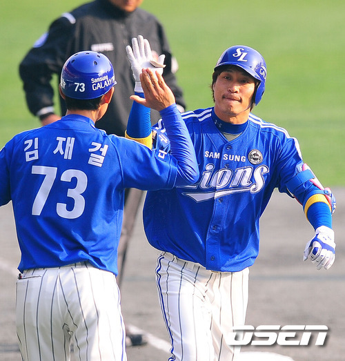'2011 롯데카드 프로야구 한국시리즈' 4차전 SK 와이번스와 삼성 라이온즈의 경기에서 4회초 무사 주자 1루 삼성 신명철이 우월 투런 홈런을 날린 후 3루에서 김재걸 코치와 하이파이브를 하고 있다.
