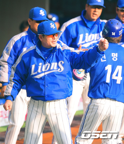 '2011 롯데카드 프로야구 한국시리즈' 4차전 SK 와이번스와 삼성 라이온즈의 경기에서 4회초 무사 주자 1루 삼성 신명철이 우월 투런 홈런을 날린 후 류중일 감독이 신명철 채태인과 하이파이브를 하고 있다.