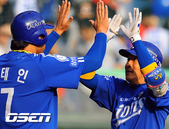 29일 오후 인천 문학구장서 열린 '2011 롯데카드 프로야구 한국시리즈 4차전' SK 와이번스와 삼성 라이온즈의 경기 4회초 무사 1루 상황에서 삼성 신명철이 2점 홈런을 날리고 채태인과 하이파이브를 하고 있다.