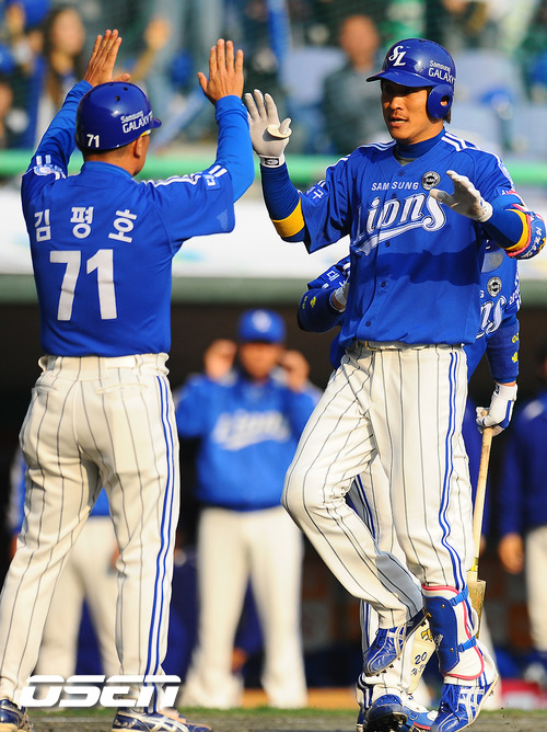 29일 오후 인천 문학구장서 열린 '2011 롯데카드 프로야구 한국시리즈 4차전' SK 와이번스와 삼성 라이온즈의 경기 4회초 무사 1루 상황에서 삼성 신명철이 2점 홈런을 날리고 김평호 코치와 하이파이브를 하고 있다.