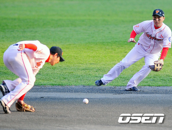 ] '2011 롯데카드 프로야구 한국시리즈' 4차전 SK 와이번스와 삼성 라이온즈의 경기 6회초 1사 주자 없는 상황에서 삼성 진갑용의 타구를 3루수 최정이 놓치자 유격수 박진만이 달려와 잡으려 하고 있다.