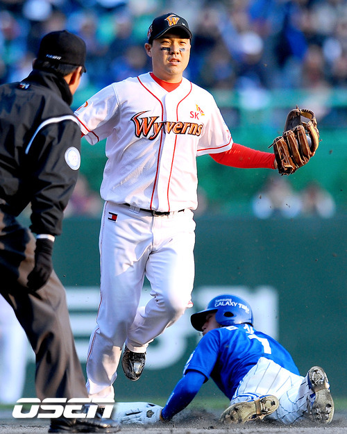 29일 오후 인천 문학구장서 열린 '2011 롯데카드 프로야구 한국시리즈 4차전' SK 와이번스와 삼성 라이온즈의 경기 6회초 1사 1루 상황에서 삼성 김상수가 도루 성공하고 있다.